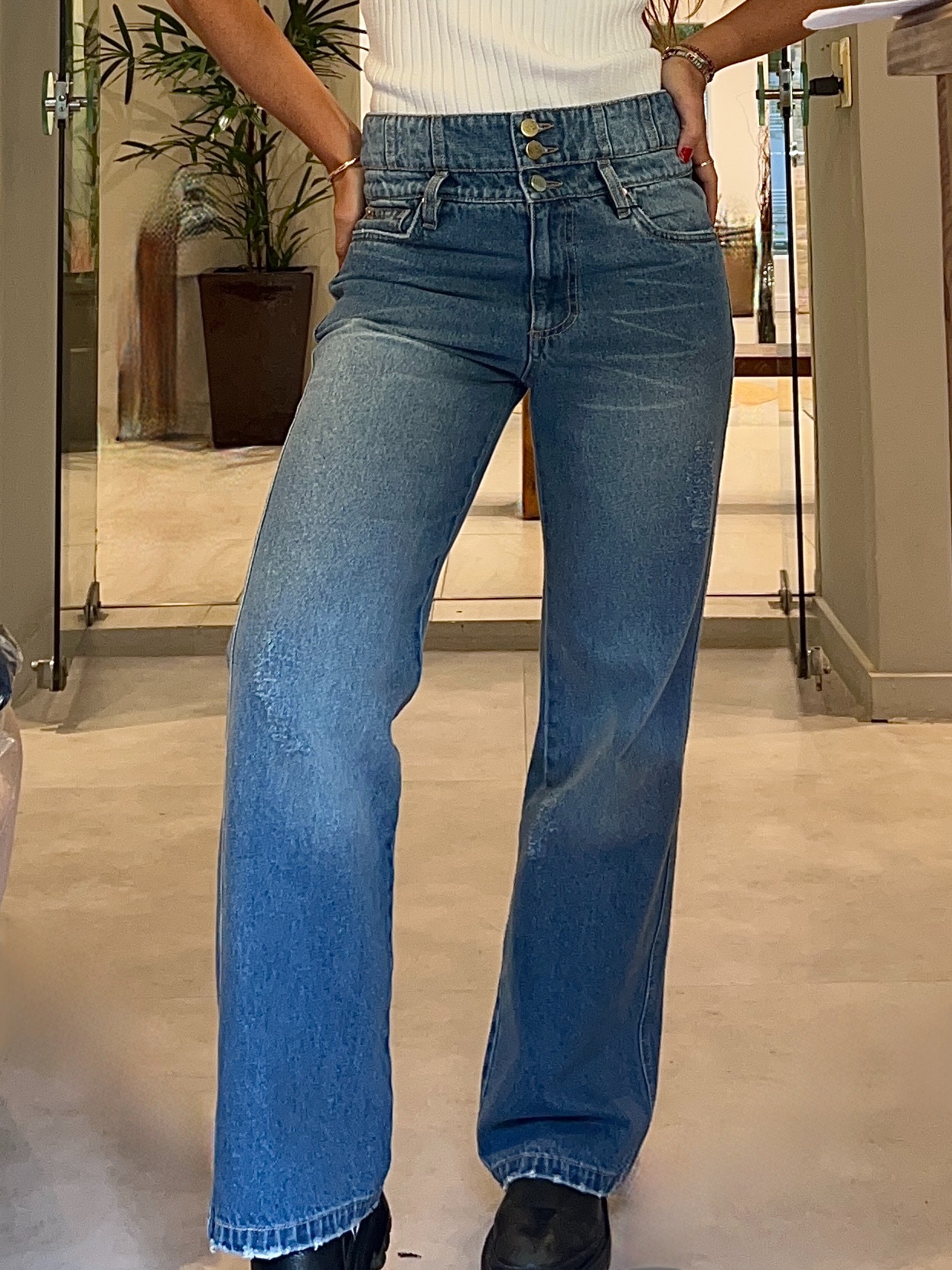CALÇA JEANS CÓS DUPLO possui 2 vezes o cós, criando um estilo mais despojado. A peça tem silhueta mais reta, cós com fechamento duplos de botão e cintura baixa, com cavalo deslocado, com caimento moderno. Tecido jeans é 100% algodão de baixa elasticidade.
