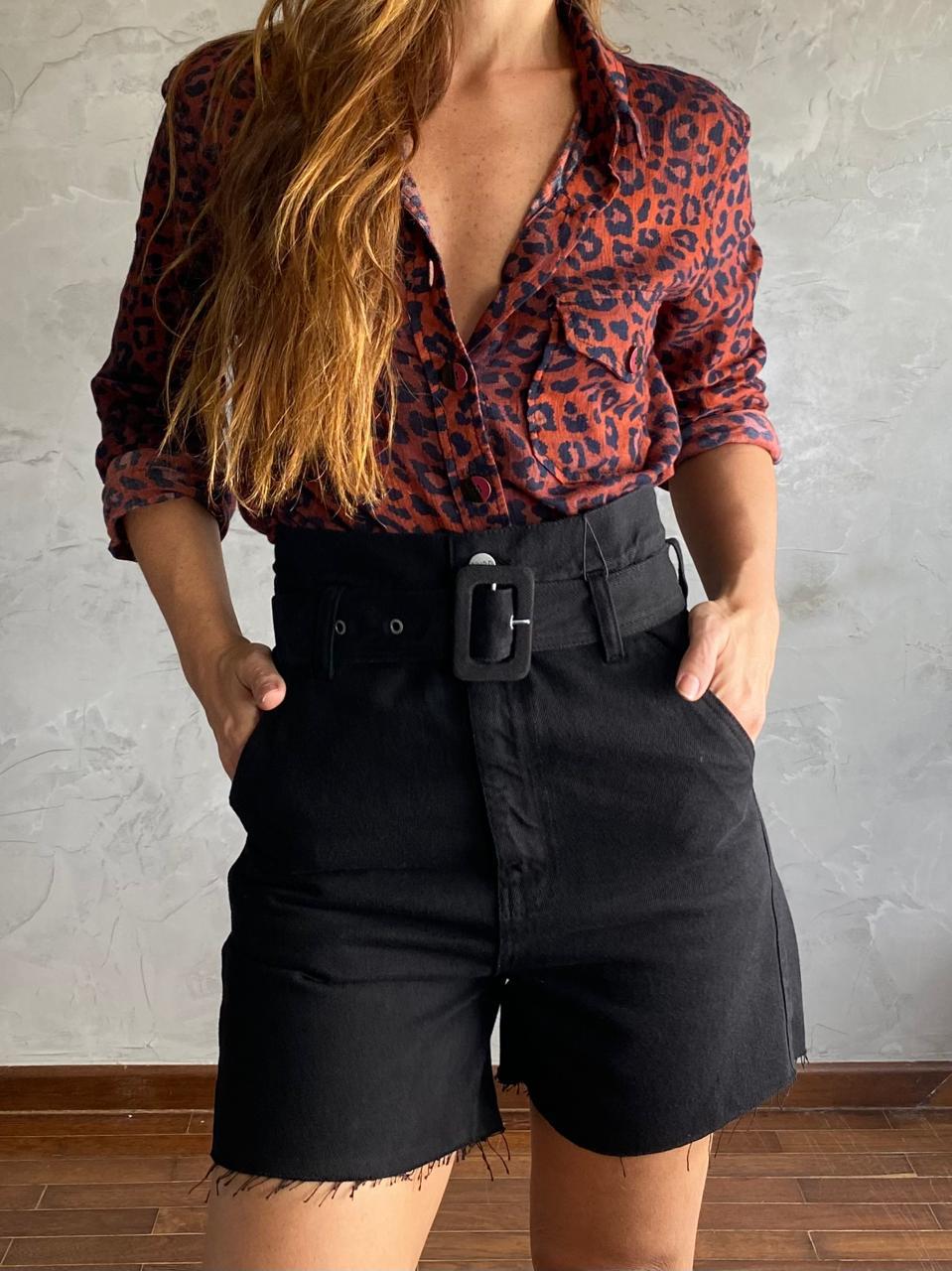 Shorts em denim preto premium com cintura super alta que alonga e estrutura. Possui cinto forrado com fivela na mesma cor, trazendo shape marcado e moderno. Barra levemente desfiada… acabamento raw que dá o toque effortless. Caimento reto, confortável, sem perder a silhueta.